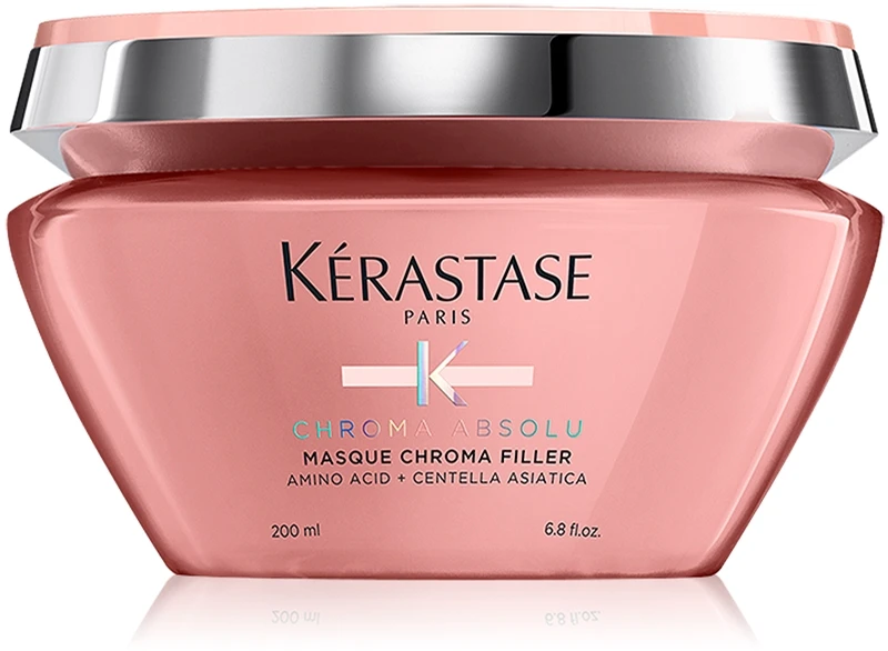 Le masque nourrissant en profondeur Kérastase Chroma Filler, enrichi en acides aminés et en extrait de centella asiatica, agit efficacement sur tous les types de cheveux poreux et sensibilisés ou abîmés par les colorations.