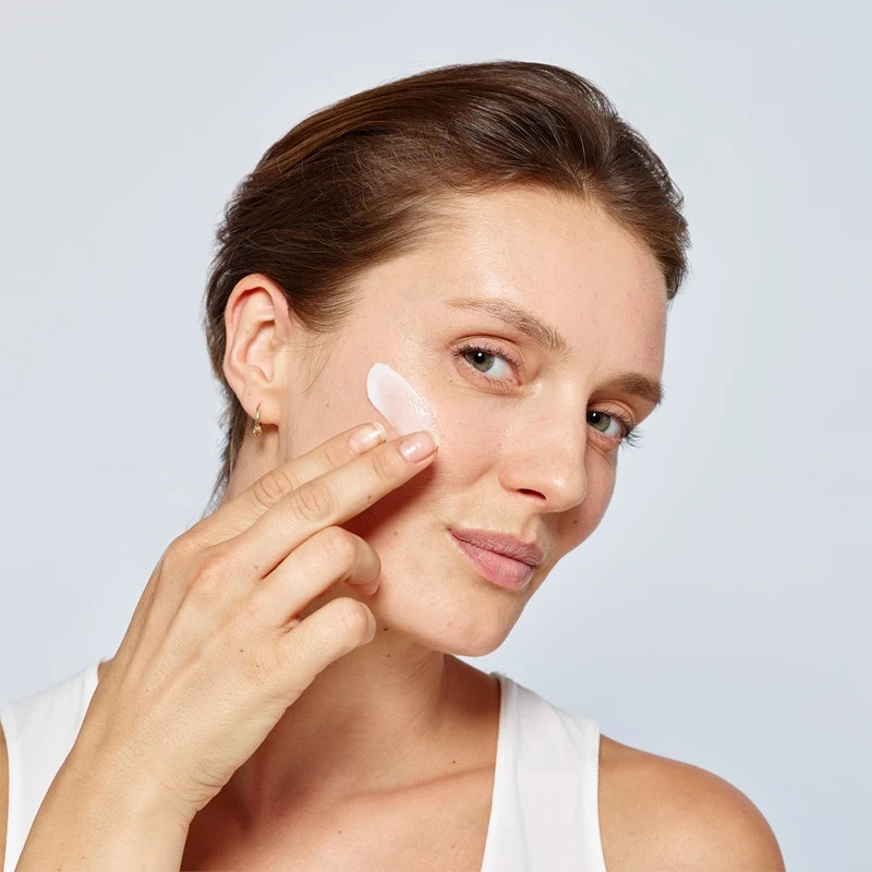Appliquez sur le visage et le cou nettoyés en effectuant de légers mouvements ascendants du bas du visage vers le haut.